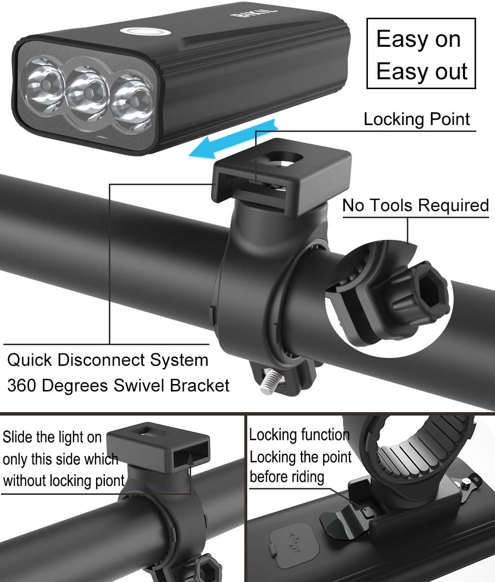 • HIGH POWER BIKE LIGHTS: The front light built in 6400 mAh USB rechargeable battery. This long run time means running out of power is much less likely. USB Rechargeable bike light can work 5 hours in super bright mode, 7 hours in medium power and 11 hours in flashing mode. The front and rear bike lights can charge from mobile phone charger, power bank or any device with a USB port.